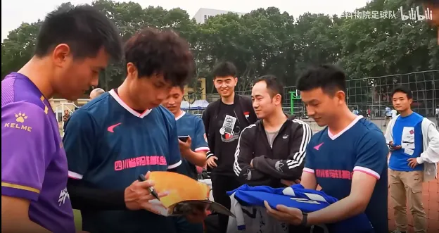 据华中科技大学物理学院足球队的社媒账号显示,蒿俊闵当天代表教职工队出战,赛后还与双方队员合影留念并进行了签名。
