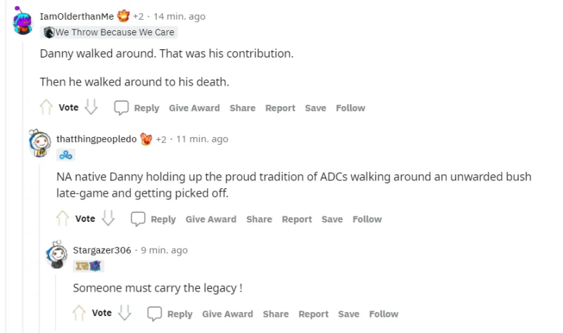 来自NA的本土选手Danny保留了北美ADC的传统:在后期去脸探没有视野的草丛,然后直接被秒了。