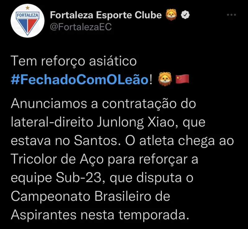 我们签下了前桑托斯球员肖俊龙,他将效力福塔莱萨的U23梯队。