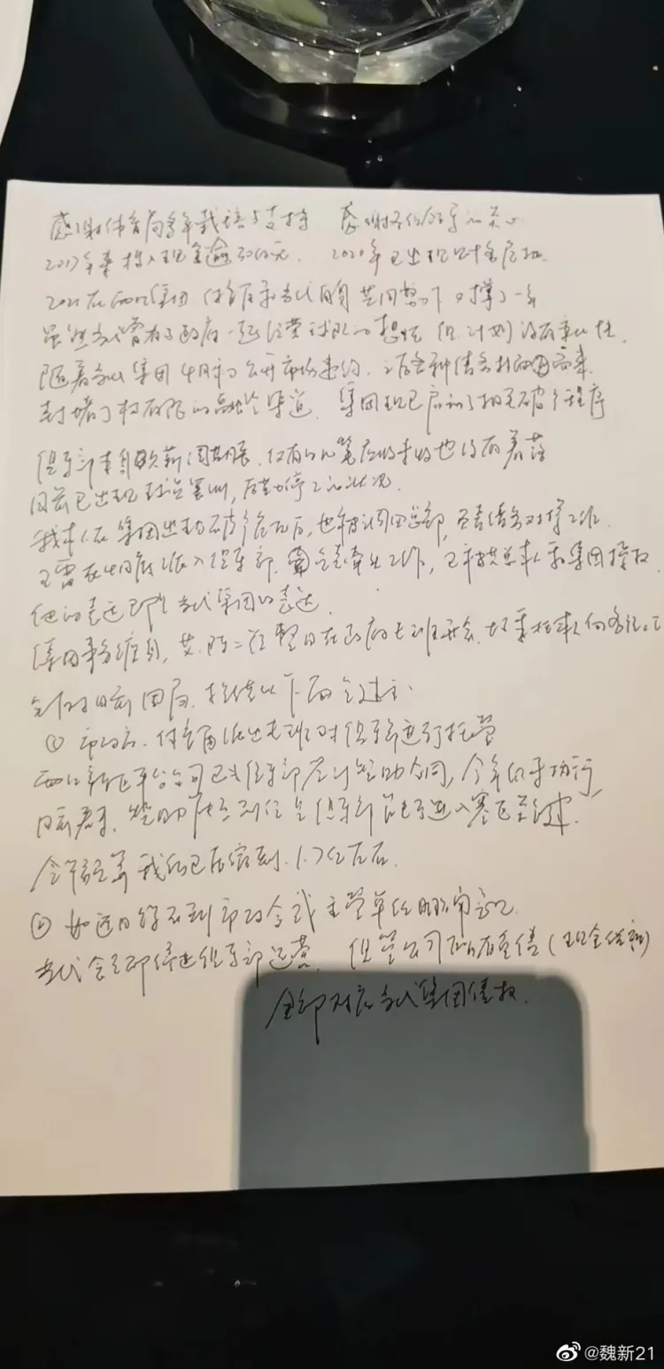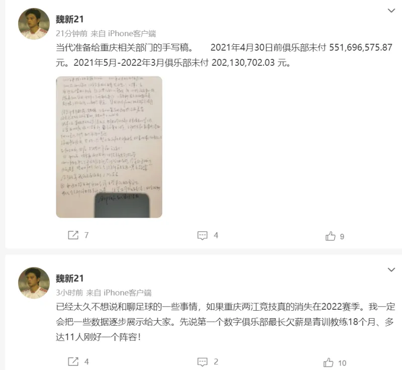魏新在微博中称,当代准备给重庆相关部门的手写稿。2021年4月30日前俱乐部未付 551,696,575.87元。2021年5月-2022年3月俱乐部未202,130,702.03元。