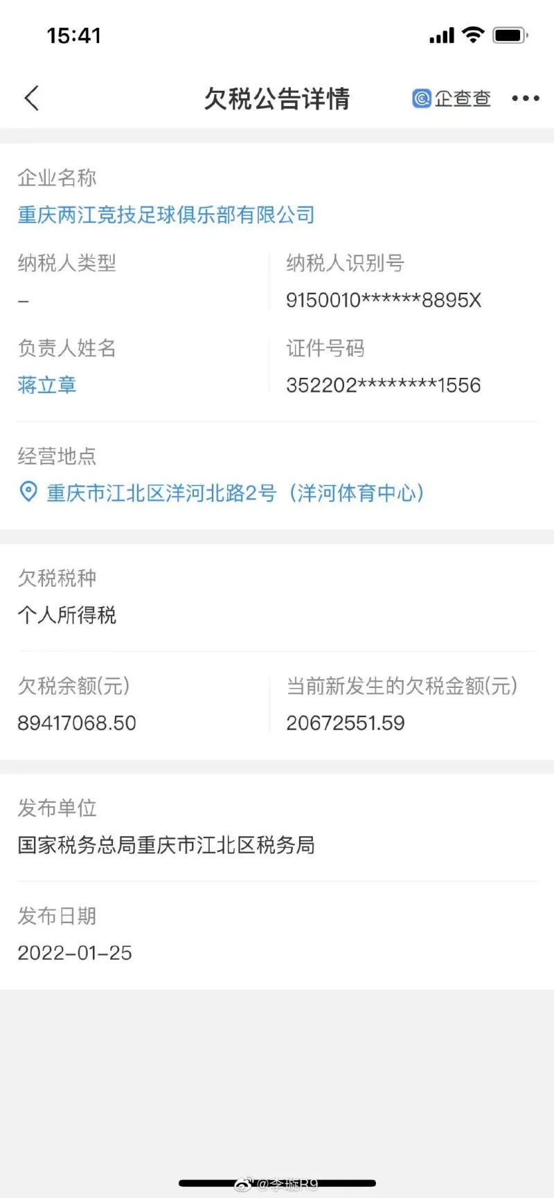 李璇表示:“在重庆两江竞技俱乐部领队发布的微博中,写道:当代准备给重庆相关部门的手写稿。 2021年4月30日前俱乐部未付 551,696,575.87 元。2021年5月-2022年3月俱乐部未付 202,130,702.03 元。 我去深入了解了一下,2021年4月30日前俱乐部未付 551,696,575.87 元中,包括欠薪、欠税和各种运营费用。简单查了一下,截至2021年1月,俱乐部欠税八千多万,算上这几个月,欠税过亿。”