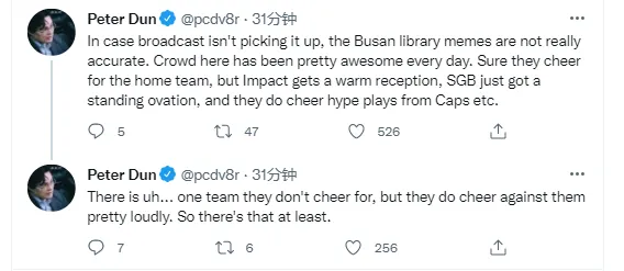 “可能是导播的镜头没有给到,釜山图书馆的表情包并不准确,这里的观众每天都很棒,当然他们为主队欢呼;但是同样也Impact得到了热烈的欢迎;SGB也得到了起立鼓掌;他们也为来自Caps的操作欢呼;等等。
