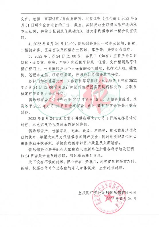 3、2022年5月24日12:00前,俱乐部将向全体人员发放离职文件,包括:离职证明/自由身证明,欠款证明(包含截至2022年5月31日所有应付未付的工资、奖金,实际发放金额将扣除应缴纳税费及社保,并综合报销及借款确定)。请大家到俱乐部一楼会议室领取。