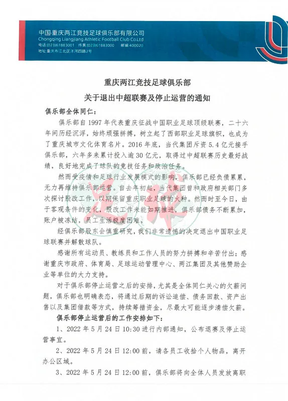 感谢所有运动员、教练员和工作人员的努力拼搏和辛苦付出;感谢重庆市政府、体育局、足球运动管理中心、两江集团及其他赞助企业等单位的大力支持。对于俱乐部停止运营之后的安排,尤其是全体同仁关心的欠薪问题,俱乐部也明确表态,将通过后期的诉讼追偿、债务回款、资产出售以及集团借款等方式,持续筹措资金,尽最大可能逐步清偿欠薪。