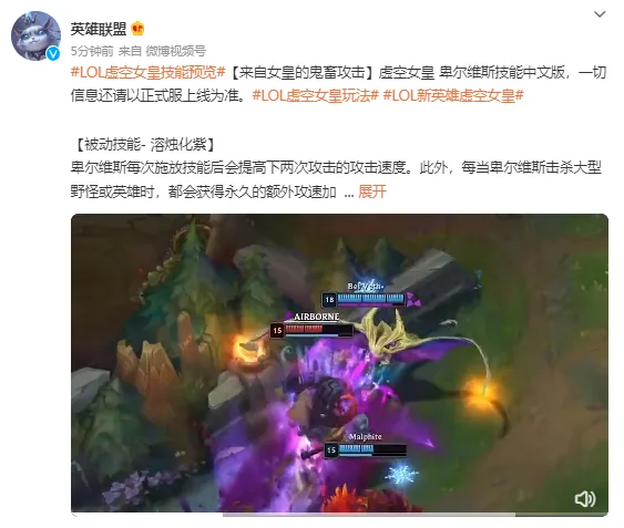05月24日讯 英雄联盟官博发布新英雄虚空女皇·卑尔维斯技能中文版,以下是微博原文: