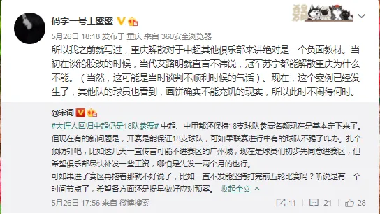 所以我之前就写过,重庆解散对于中超其他俱乐部来讲绝对是一个负面教材。当初在谈论股改的时候,当代艾路明就直言不讳说,冠军苏宁都能解散重庆为什么不能。(当然,这可能是当时谈判不顺利时候的气话)。现在,这个案例已经发生了,其他队的球员也看到,画饼确实不能充饥的现实,所以此时不闹待何时。