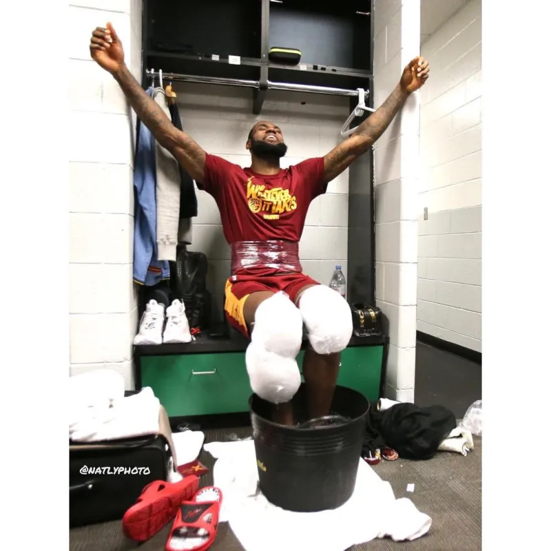 该摄影师分享了一张他在2018年东部决赛抢七大战后在骑士更衣室内拍摄的照片,图中骑士前锋勒布朗-詹姆斯在打满全场48分钟后,其腰部和腿部缠满冰袋并在冰敷双脚,仍热情洋溢地举起双臂指挥队友呐喊球队口号庆祝胜利。