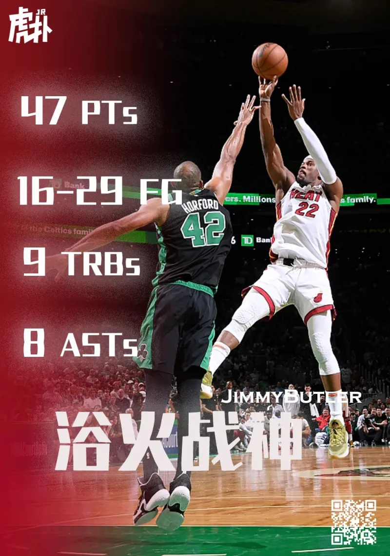 本场比赛,热火球员吉米-巴特勒出战45分钟,29投16中,其中三分球8投4中,罚球11投11中,得到47分9篮板8助攻4抢断1封盖。