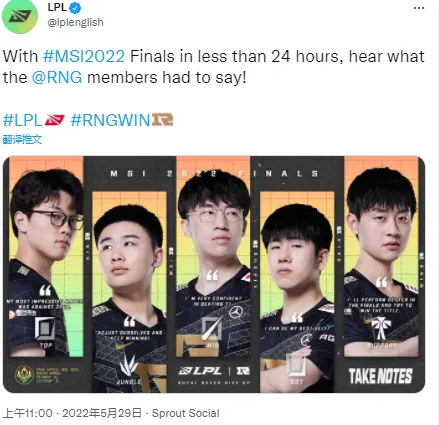 05月29日讯 离2022MSI决赛正式打响已不足4个小时,LPL官推发布动态为决赛预热并为LPL加油,大意如下: