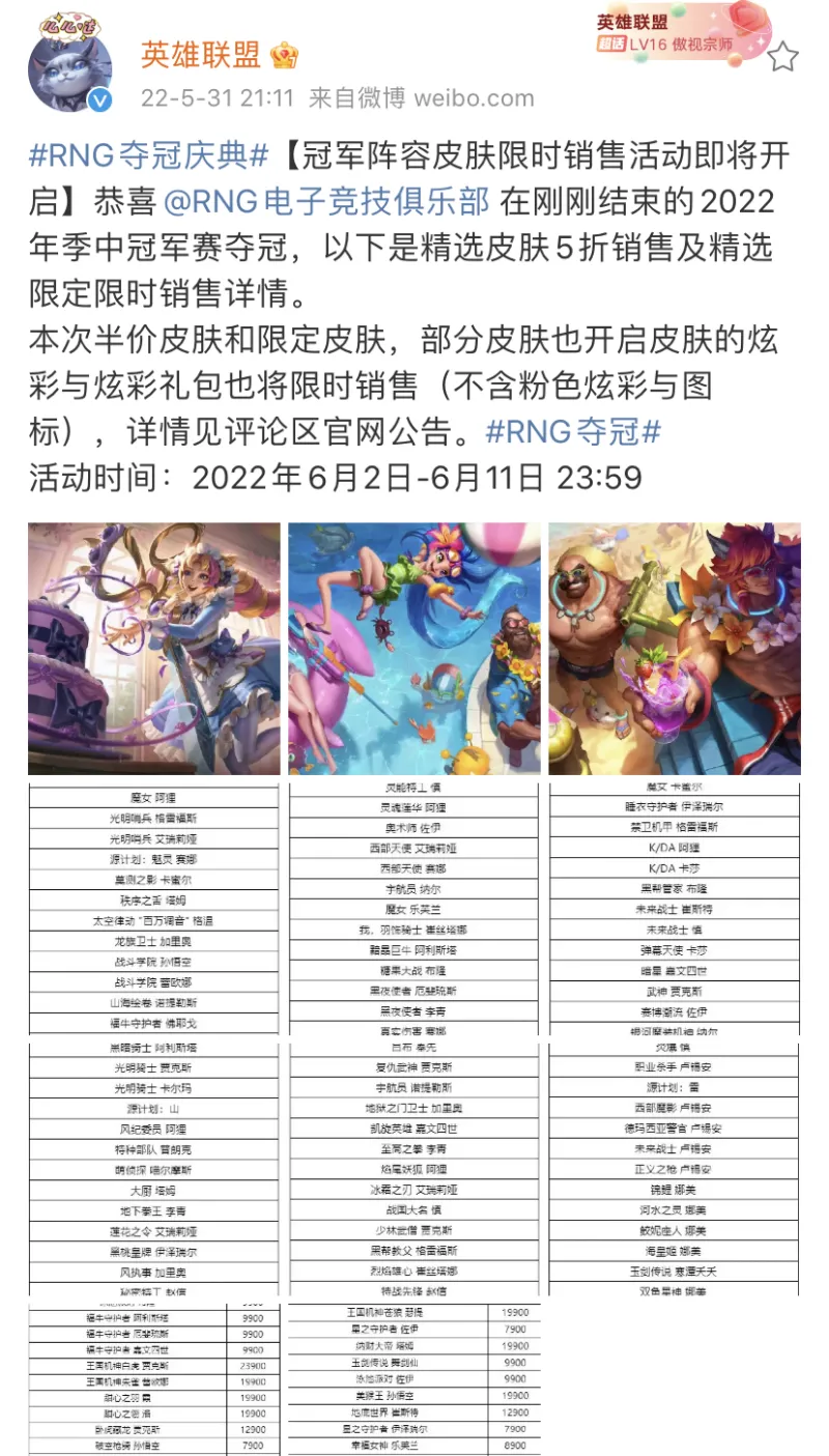 05月31日讯 RNG夺冠庆典即将开启,以下是微博原文: