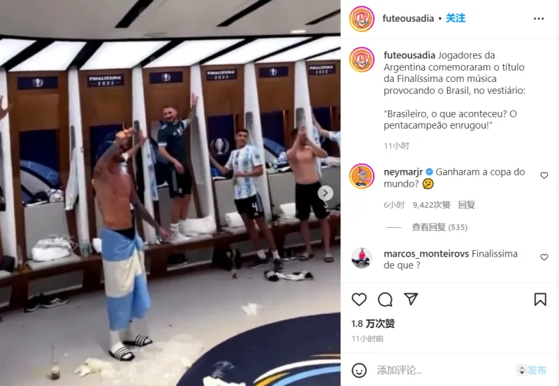 据外媒报道,阿根廷球员赛后在更衣室里放着音乐,嘲讽道:“桑巴军团怎么了,五届世界杯得主只能皱着眉(看着我们庆祝)?”而内马尔在此条动态下留言回击:“他们这是赢得大力神杯了嘛?”