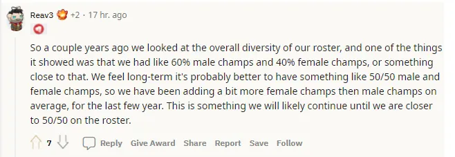 设计师表示“最近几年,我们在查看英雄的整体差异时发现,目前的男性英雄和女性英雄的数量比大概是60%对40%,从长远来看,男女英雄数量保持50%会更好。所以在过去一段时间我们出了更多的女性英雄,这件事我们可能会继续做下去,直到男女英雄数量比接近50%为止”