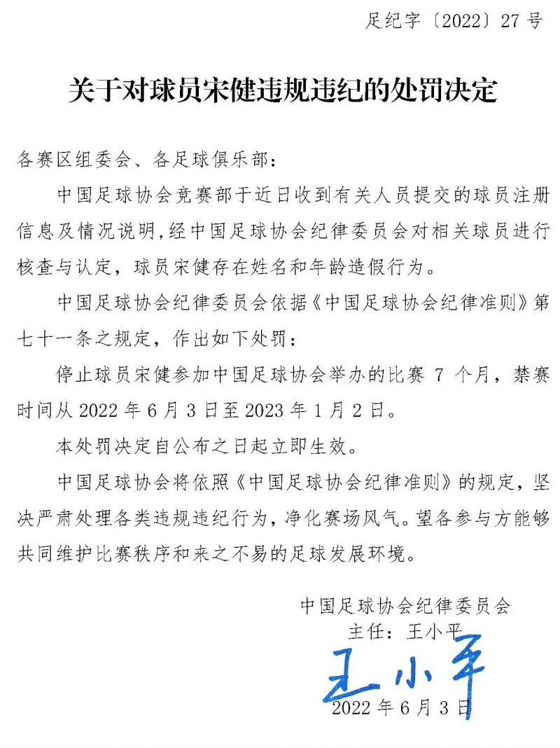 公告二:球员宋健姓名及年龄造假,禁赛六个月