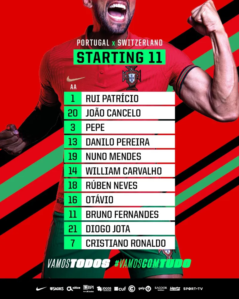 葡萄牙首发:1-帕特里西奥、20-坎塞洛、3-佩佩、13-达尼洛-佩雷拉、19-努诺-门德斯、14-威廉-卡瓦略、18-鲁本-内维斯、16-奥塔维奥、11-B费、21-若塔、7-C罗