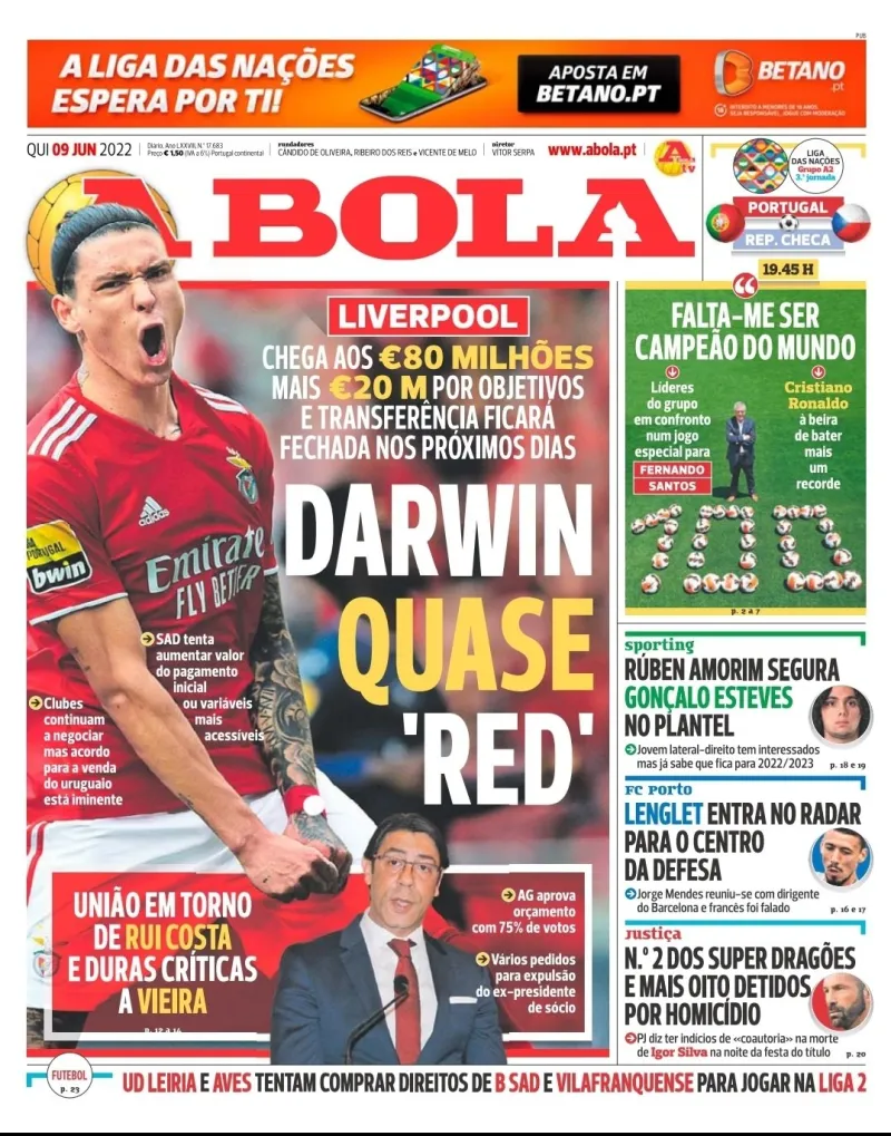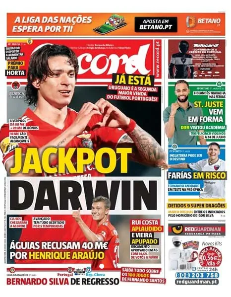 06月09日讯 根据葡萄牙媒体记录报,球报当地时间6月9号的头版消息,他们将努涅斯接近加盟利物浦放到了头版上,并用JACKPOT(大奖)来形容努涅斯的这笔潜在交易。