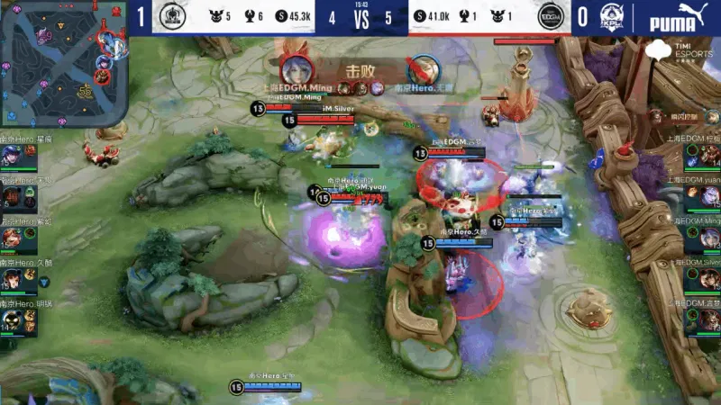 15分48秒,Ming弈星大招留住人,关羽分割战场,Hero位置不好团战脱节被击杀三人