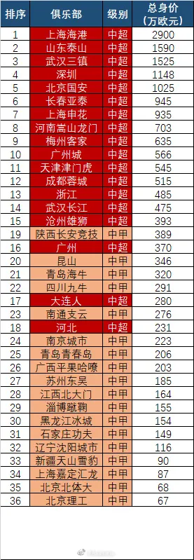 朱艺在微博中介绍称:“中甲开赛前德转也已经对中甲身价进行了微小更新(主要针对新球员)。目前前中国两级联赛的俱乐部身价总身价榜如下。(市场价值不一定反映实力,请理性观看,拒绝恶意对比) ”