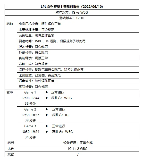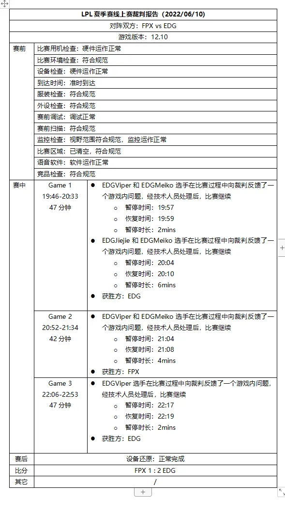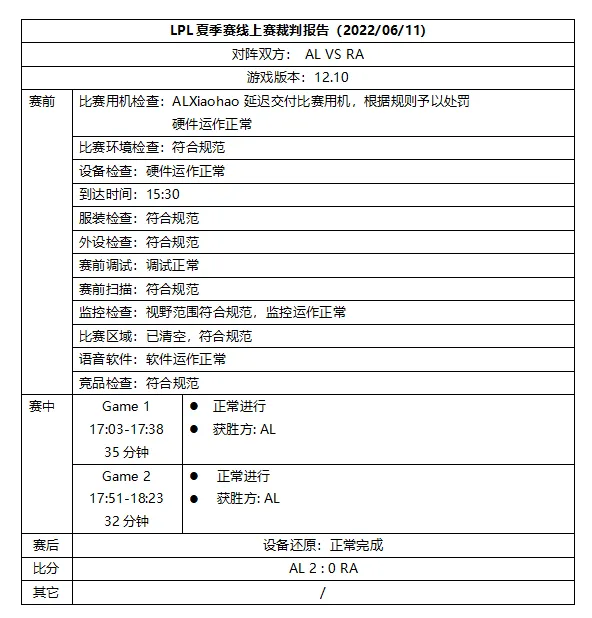 06月13日讯 英雄联盟官网发布LPL夏季赛裁判报告(06月10日与06月11日),具体内容如下: