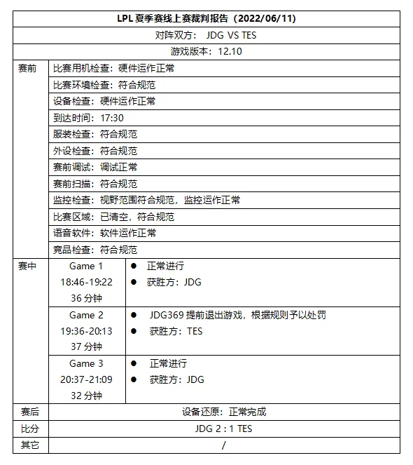 Game2 JDG.369提前退出游戏,根据规则予以处罚