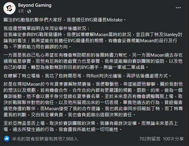 关注BYG动态的伙伴们大家好,我是现任BYG营运长Mistake。我这边想简单说明去年茂安事件后续状况: