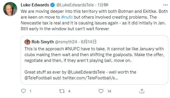 06月15日讯 根据每日邮报纽卡斯尔方面记者Craig Hope的最新报道,纽卡引进斯文-博特曼和雨果-埃基提克的行动今天上午仍然停滞不前。
