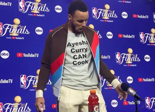 随后,在勇士赢下天王山之后,库里赛后新闻发布会上身穿一件写着“Ayesha Curry会做饭”的T恤。库里无疑是在支持自己的妻子。
