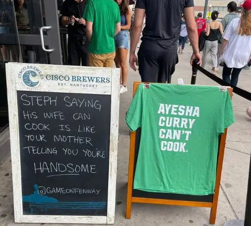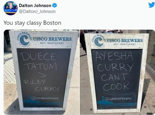 起因是,这叫餐馆在自家招牌上写上了一些针对库里家人的话。其中一句是“Duece Tatum>Riley Curry”,另一句是“Ayesha Curry不会做饭”。NBC体育湾区记者Dalton Johnson在推特上晒出了这两句话。