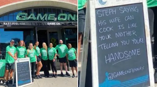 “Game on”餐馆今天再次进行回应,他们的员工们手中扶着一块招牌合影。招牌上这样写道:“斯蒂芬说他妻子会做饭,就像是你妈妈告诉你你很帅一样。”