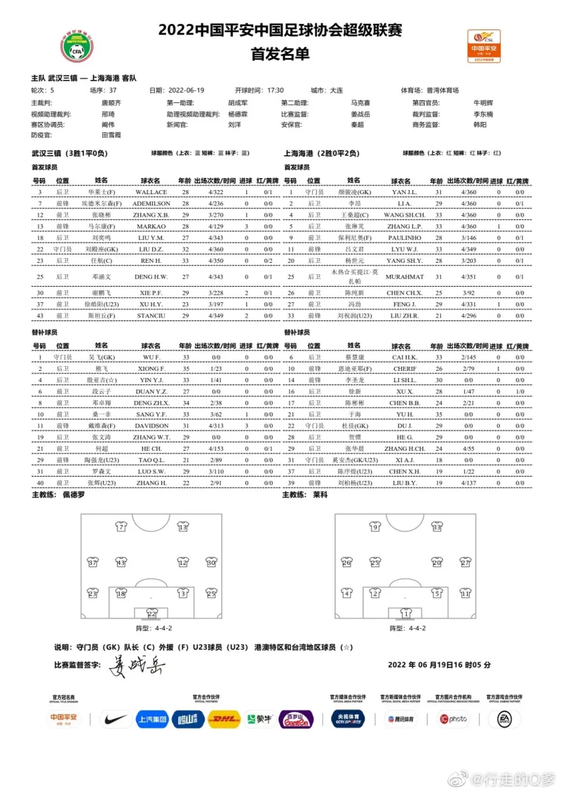 06月19日讯 今天下午17:30,中超第5轮,武汉三镇vs上海海港,赛前双方公布了首发阵容。