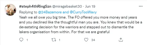下方也有网友回应道:“你离开勇士转投湖人,从内部将湖人的银河战舰瓦解,帮我们扫除了重要的竞争对手,为此我们心存感激。”