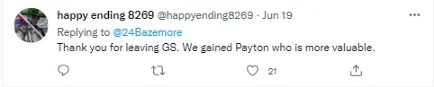 还有网友说:“听我说谢谢你,谢谢你离开勇士,让我们得到了更有价值的小佩顿。”
