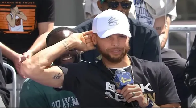 06月21日讯 勇士后卫斯蒂芬-库里在夺冠庆典期间进行了演讲。