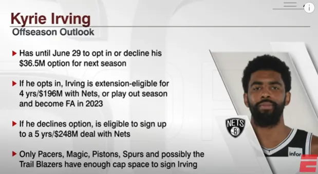 3:若欧文跳出合同,他能和篮网签下5年2.48亿美元的合同。