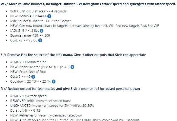 改动目标:使弹射更加可靠,不再“无限弹射”。W技能现在有攻速加成,并且和攻速的相性更好