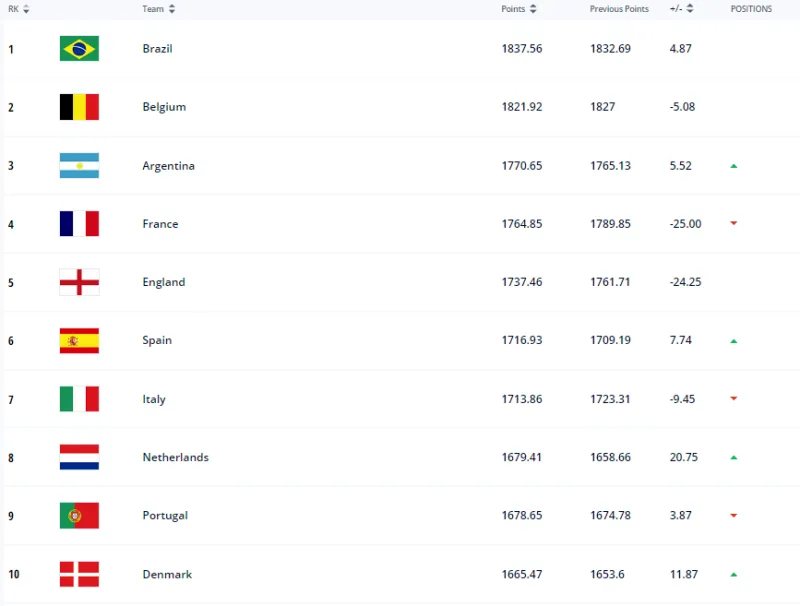 06月23日讯 国际足联官方公布了最新一期男足世界排名,巴西队仍居世界第一,阿根廷则超越法国升至第三。