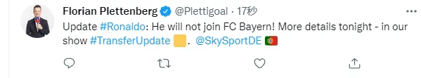 06月24日讯 德国天空体育著名记者Florian Plettenberg最新报道,他表示C罗不会加盟拜仁,更多细节将在今晚的天体节目中透露。