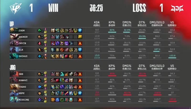 35分钟:UP拿下大龙,JDG强开团被反打出零换五,UP一波结束比赛