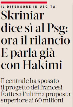06月24日讯 来自《米兰体育报》国米跟队记者Filippo Conticello的报道,什克里尼亚已经同意加盟巴黎圣日耳曼,并且与前队友阿什拉夫有过交流,目前谈判也已经重新开启。