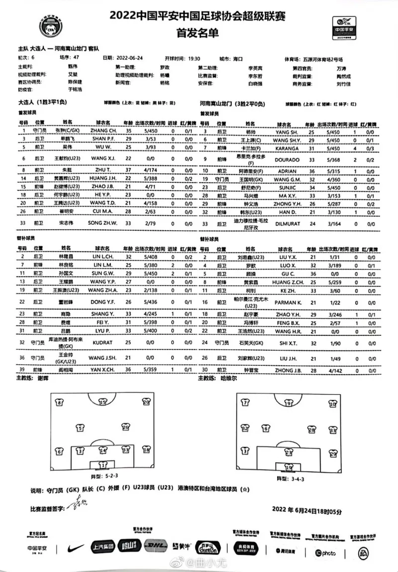06月24日讯 北京时间6月24日下午19:30,中超第六轮,大连人对阵河南嵩山龙门。赛前,双方的首发名单已经公布。