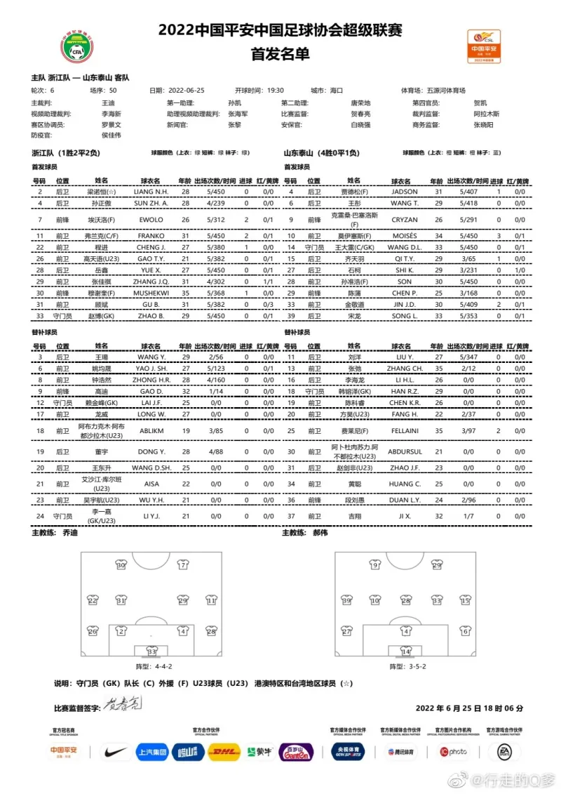 06月25日讯 北京时间19:30,中超第六轮浙江队对阵山东泰山,赛前双方公布了首发名单。
