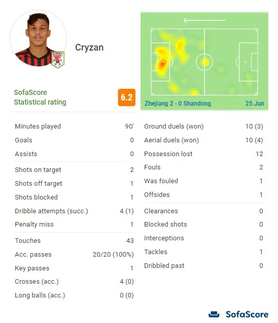 06月26日讯 中超联赛第6轮,山东泰山0-2不敌浙江队,泰山队外援克雷桑本场罚丢点球,赛后也成为了球迷热议的焦点,根据Sofascore给出的全场数据和评分来看,克雷桑全场评分6.2分,20次传球20次成功,10次地面对抗仅3次成功,10次空中对抗4次成功,12次丢失球权。