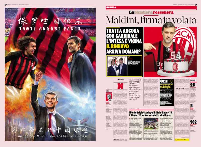 06月26日讯 6月26日是AC米兰名宿马尔蒂尼的54岁生日,中国球迷众筹包下了《米兰体育报》的第三版(除了头版和专刊之外最重要的版面),为马尔蒂尼庆祝生日。