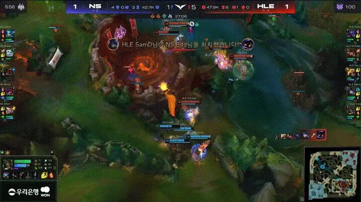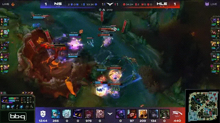 比赛第21分钟,双方在小龙区域爆发团战。HLE猴子闪现开到NS双C强秒小法,HLE打出一波0换4拿下大龙一举奠定优势