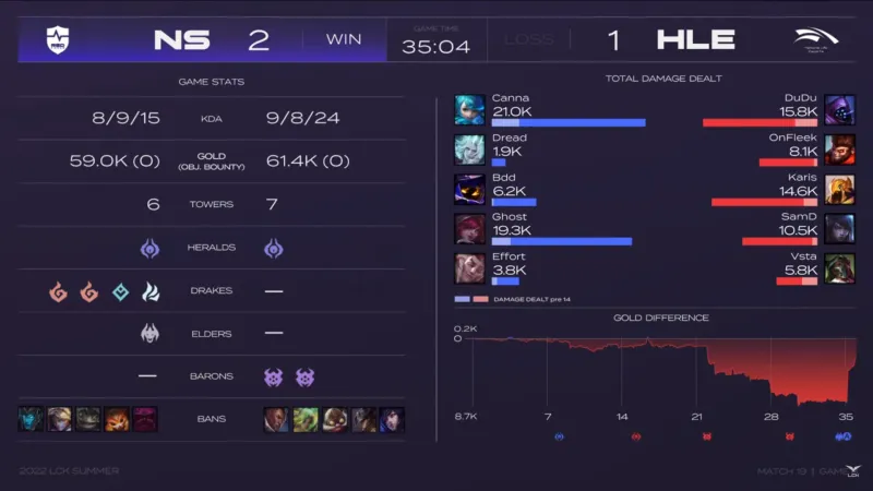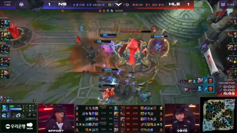 比赛第27分钟,NS拿下火龙魂。但HLE果断选择开团。猴子闪现开到三人,沙皇最后跟上帮助HLED打出一波1换4一波推掉中路高地。将经济差距拉开到7k。