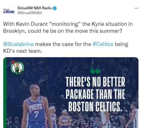 06月27日讯 近日关于KD的转会风波闹得沸沸扬扬,在季后赛中淘汰篮网的凯尔特人球迷的内心也是有了一些波澜,似乎有人想要复刻一次“KD去勇士”2.0事件。