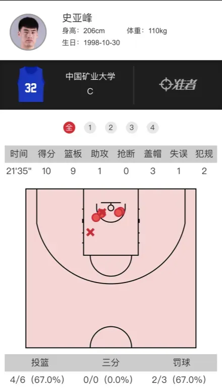 全场比赛,史亚峰出战约21分钟,投篮6中4,罚球3中2,得到10分9篮板1助攻3盖帽。