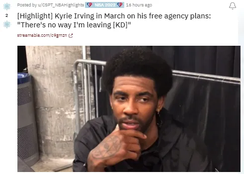 今日美国媒体找出了欧文在三月份接受采访时的一个片段,在采访当中,谈及其夏天成为自由球员后的计划时,欧文曾说:“我不可能弃KD而去(There's no way I'm leaving [KD])。”