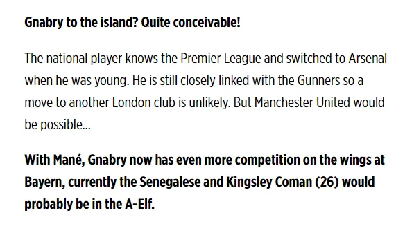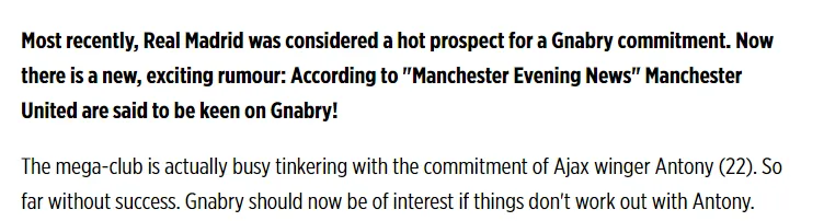 图片报的评论表示,最近,皇马被认为很有希望引进格纳布里,而曼联正在猛烈追逐阿贾克斯边锋安东尼。如果追逐巴西国脚失败,应该会对格纳布里感兴趣吧。