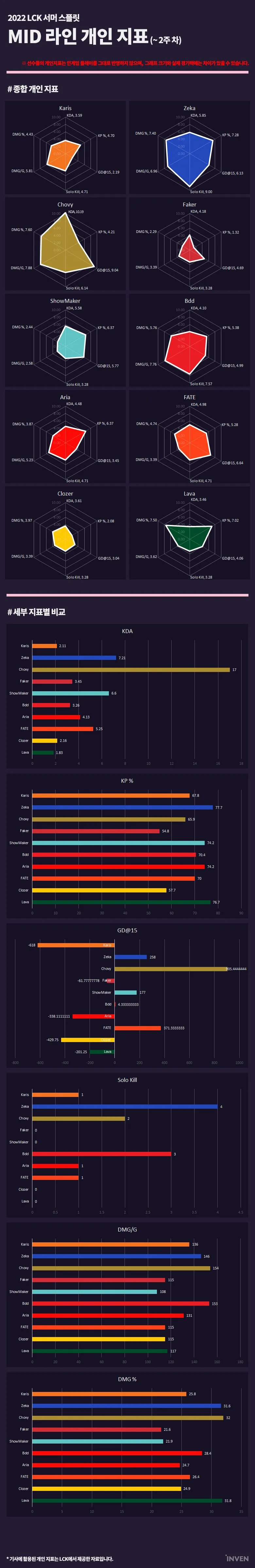 06月28日讯 韩媒INVEN发布2022LCK夏季赛第二周数据,具体内容翻译如下: