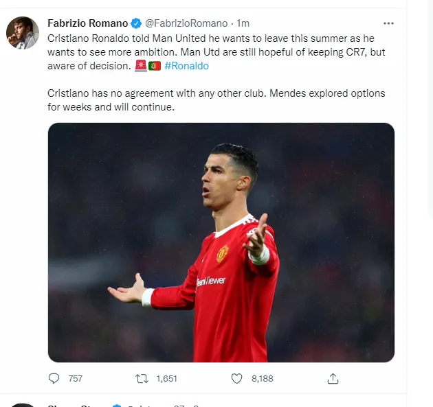 克里斯蒂亚诺-罗纳尔多告诉曼联他想在今年夏天离开,因为他想看到曼联展现更大的野望。曼联希望留下C罗,但也要等他的决定。